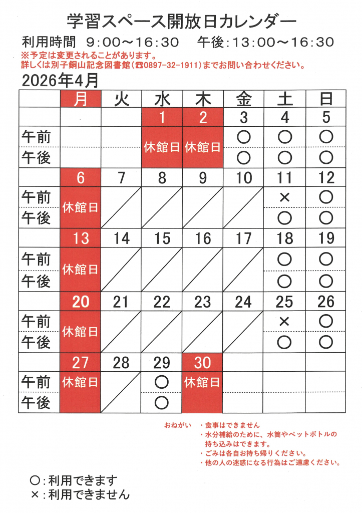 「学習スペース開放日カレンダー」