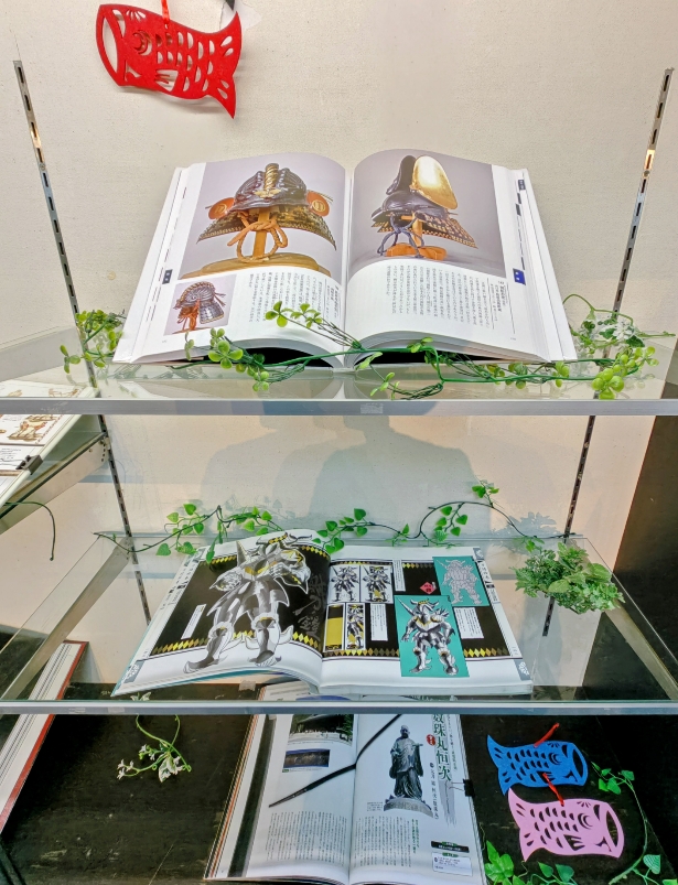 展示ケースに『兜 刀剣の世界』の紹介をしています。